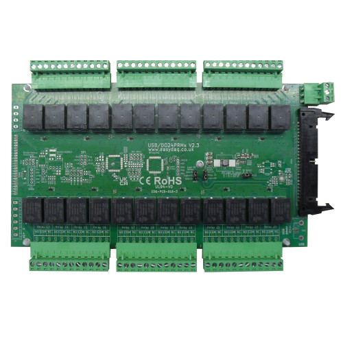 Suitable for low current, direct logic drive control - compatible with our USB24DIO board and pin compatible with the NI DIO24/6503 card. This board requires a 5V DC supply. PC/MAC/Pi control. Access to all relay contacts is via 2 part (male/female), side entry screw terminal block connectors, mounted at right angles along both sides of the board. They are designed to be easily mounted in a stack/matrix arrangement, with rapid removal of all wired connections so that the cards can be rapidly swapped in a maintenance situation or re-used elsewhere without the need for unscrewing all the wired connections.